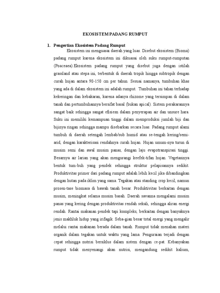 Posting Lebih Baru Posting Lama Beranda. Ekosistem padang rumput ini merupakan ekosistem yang memiliki curah hujan yang. Padang Rumput Stepa - Didominasi oleh vegetasi rumput-rumputan dalam skala luas - Curah hujan dibawah savana yakni 25 75 cm pertahun - Di dominasi oleh hewan-hewan herbivora 35.